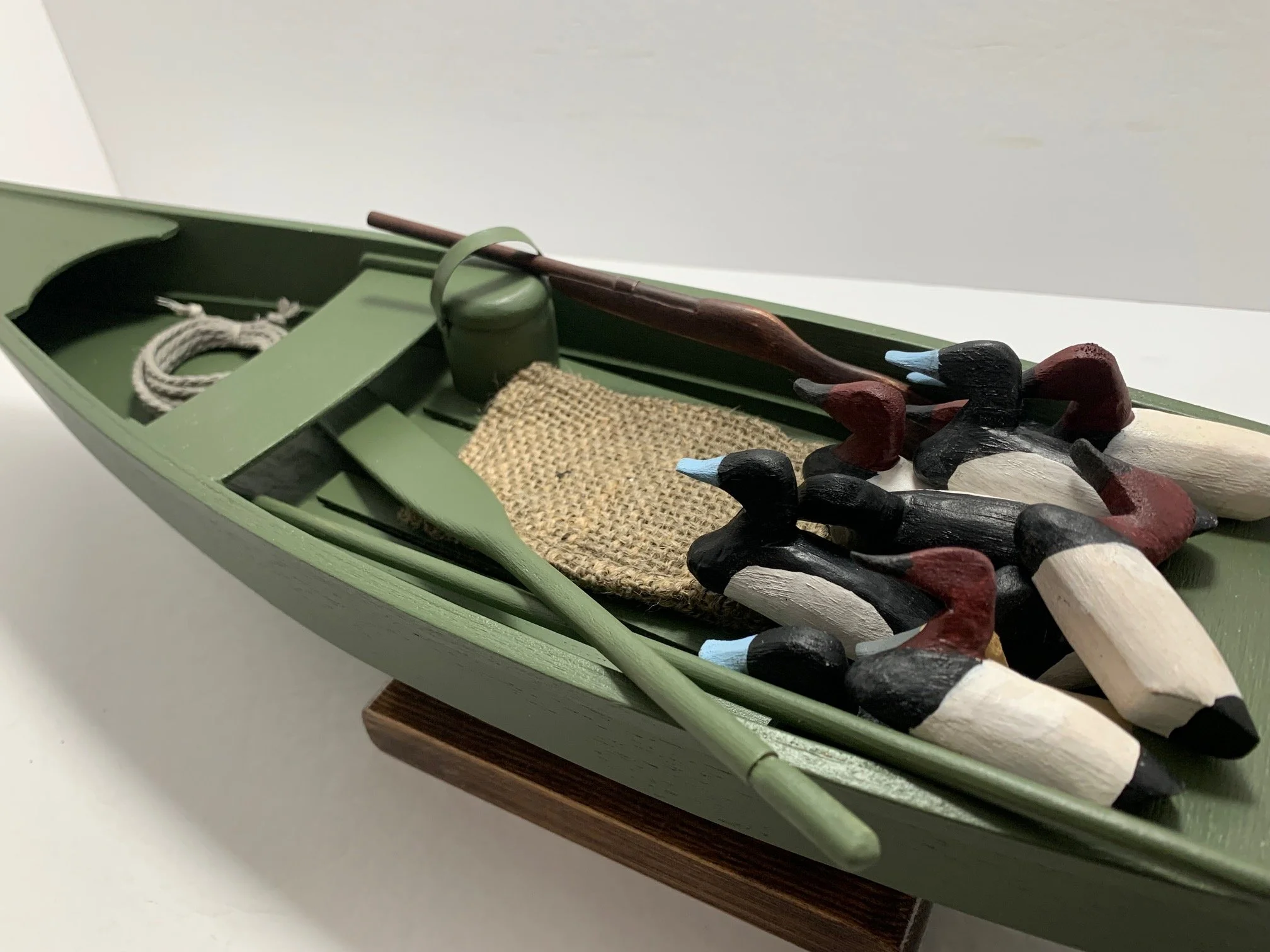 Approximately 24 inches long and comes with shotgun, shell bucket, 12 decoys, rope, paddle, push pole and stand.